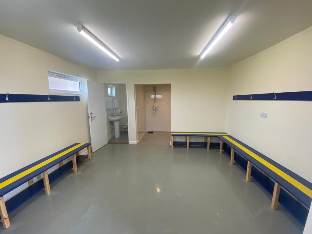 Each changing room has a toilet and showers. For the floors, they simply applied garage floor paint to the concrete base.