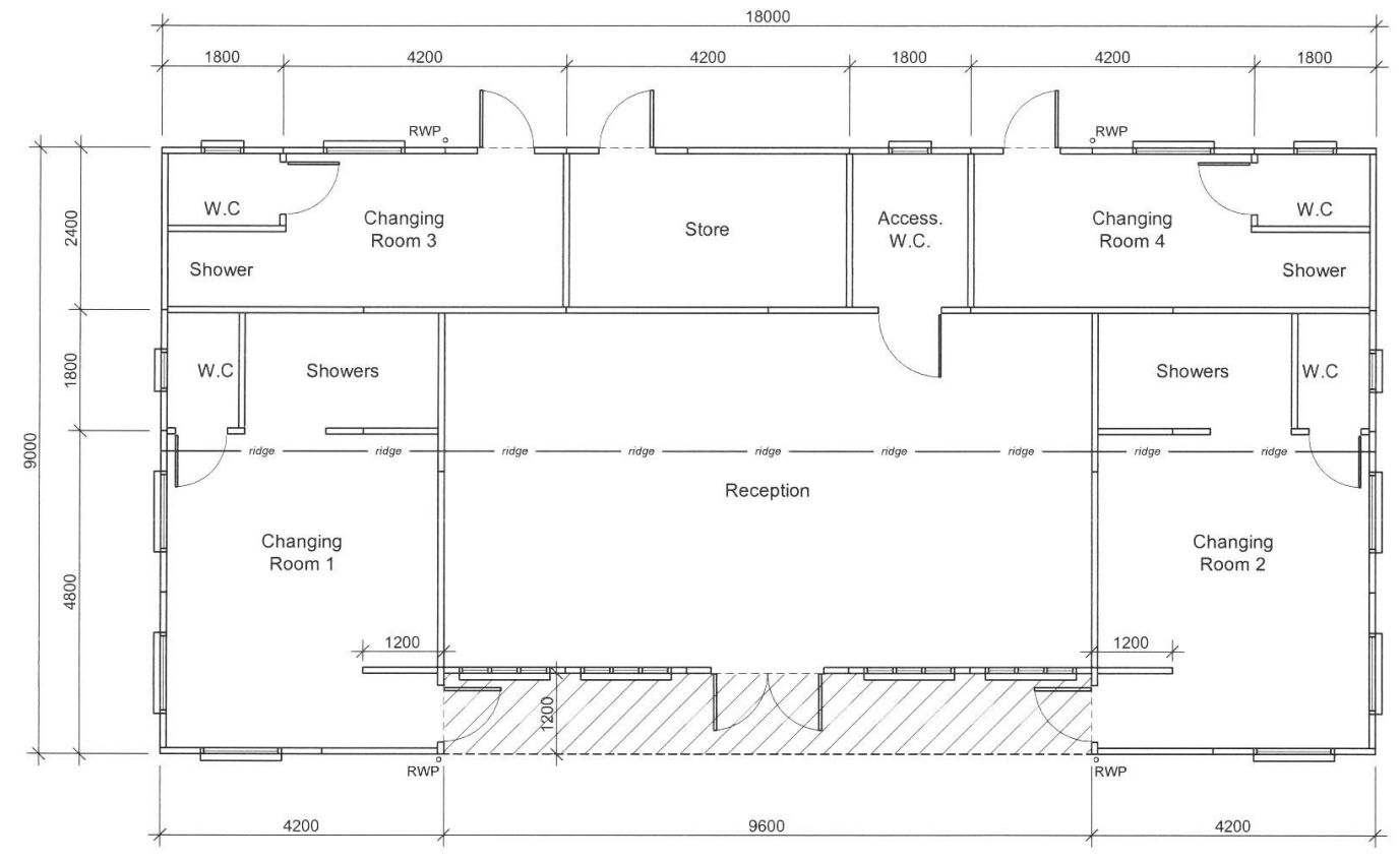 As with our floor plan, Kineton have a central social space ("Reception") with main changing rooms either side, all accessed from the front veranda. They also have two smaller changing rooms and store, only accessible from the rear of the pavilion.