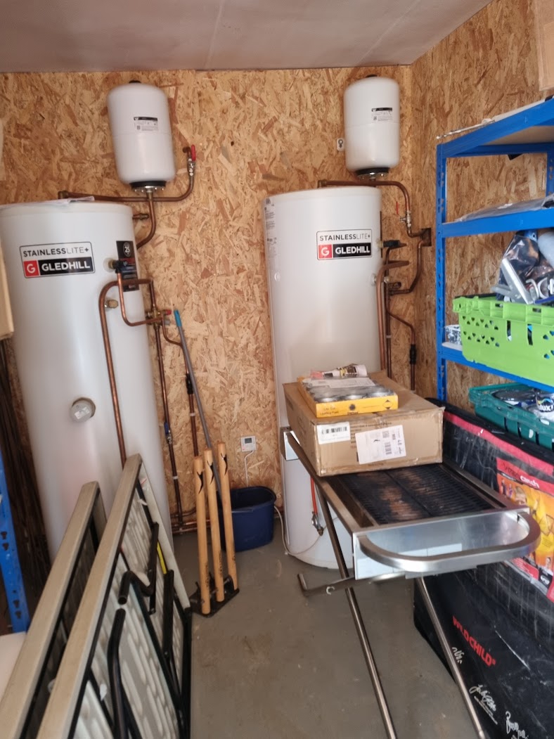 Hot water is provided by two pressurised hot water tanks (megaflows) in the store room, which operate on a timer switch